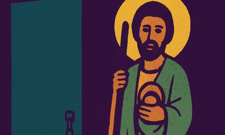 Entonces lo escucho: un golpe leve en la puerta, como si alguien tocara desde el otro lado del viento. Me levanto, la abro con cautela… y lo primero que veo es la imagen de un santo, cubierta de arena, mirándome con los ojos del mar.