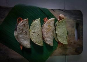 Carne de cerdo marinada en cítricos y achiote, ahumada a la vista. Las pellizcadas —alrededor de 150 pesos— pueden llevar tegogolo, un caracol local que aporta un toque salino y crujiente.