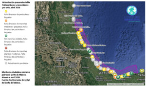 La Red Corredor Arrecifal del Golfo de México informó que, pese a declaraciones oficiales emitidas el 16 de marzo sobre la limpieza total de playas en pocos días, inspecciones realizadas en abril junto con la Procuraduría Federal de Protección al Medio Ambiente (Profepa) confirmaron la persistencia de hidrocarburos en decenas de puntos. Según sus registros, 16 sitios presentan manchas grandes, 17 medianas y en la mayoría se observan residuos fragmentados de difícil recolección.